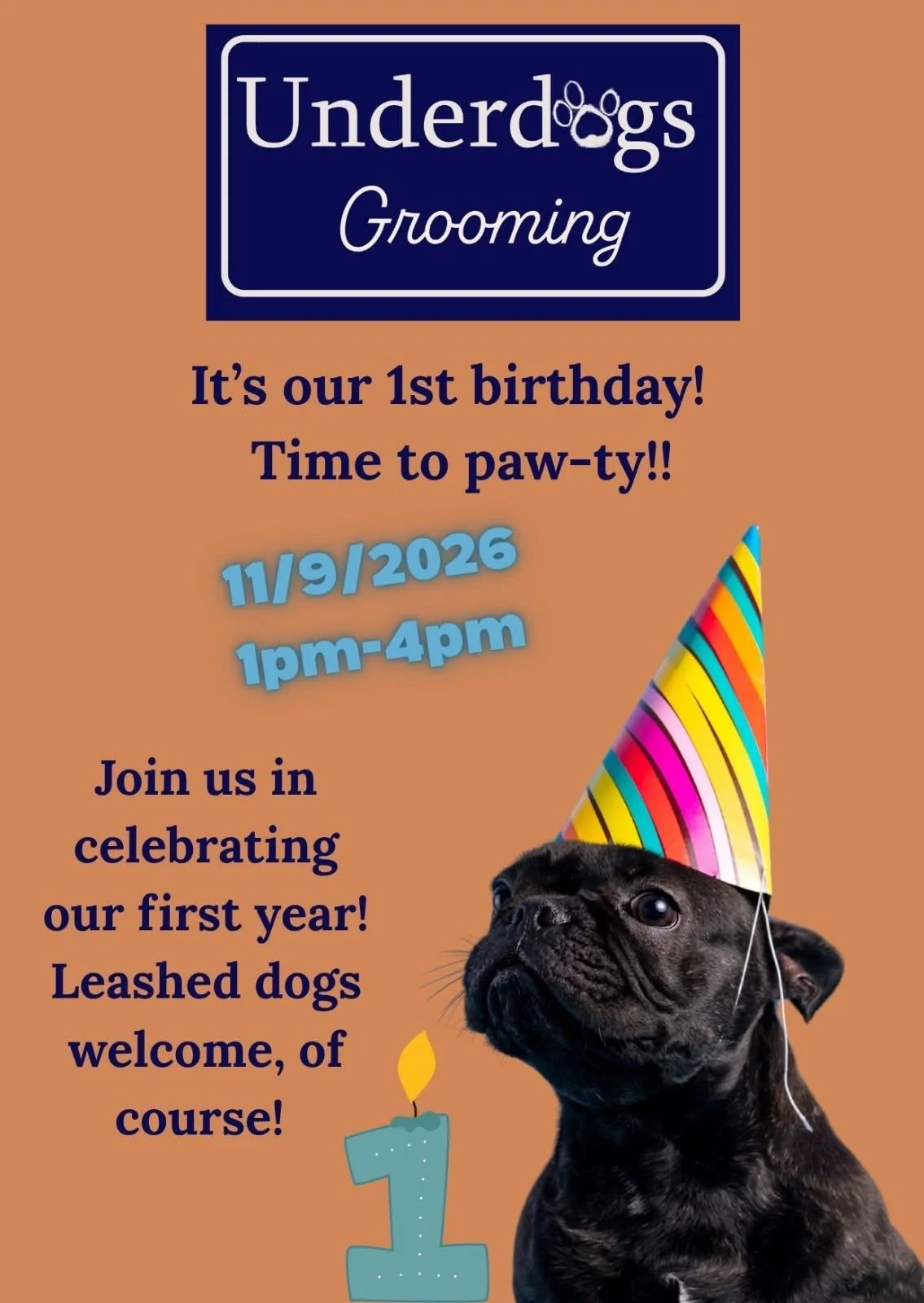November 9th 1-4pm Underdogs Grooming first birthday party!